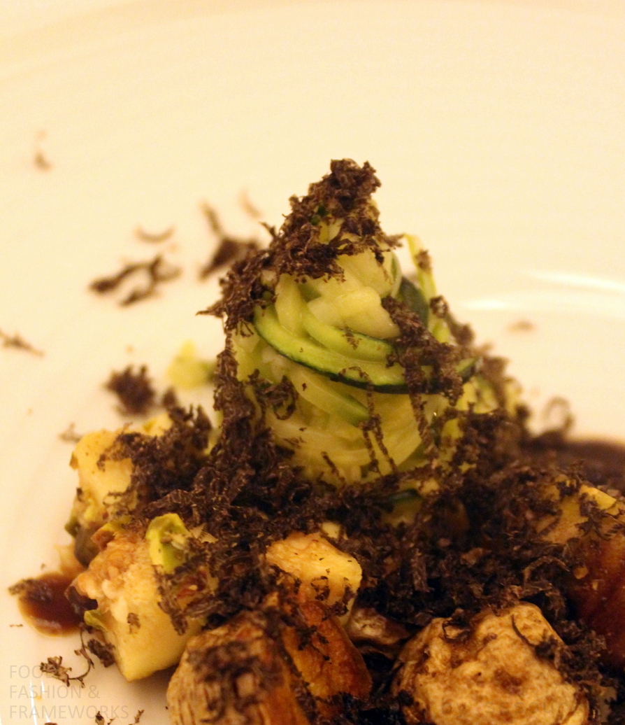 What arrived next tested my knowledge of food disguise. For what looked like seashells from a mermaid’s lagoon ended up being potato with zucchini, flooded in fig molasses and topped with ample helpings of hairy summer truffle shavings, pistachio bits and a cucumber salad. The entire construction was alarmingly reminiscent of non-food objects. The combination was an inspiring but odd one: the meatiness of the potatoes were in contrast to the gentleness of the salad, and the fig and truffle competed in a sweet and bitter competition where everyone kept playing, but nobody emerged victorious. Nonetheless, the potato and the looks on this persona made up for the confusion in its relay.