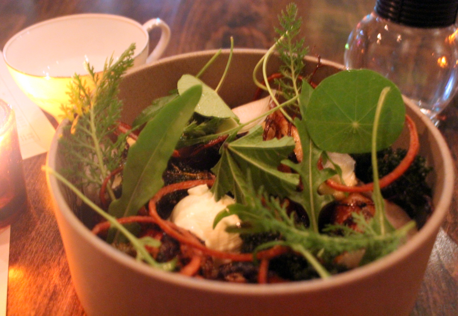 For a lighter salad option, I chose what would redefine what I thought of a salad from the last time I had one that was as beautiful. I ordered young turnips with banana vinegar and crème fraîche, and what arrived whisked me into dreams of childhood and adventures in Narnia, due to the balsam fir and herbaceous aroma. It tasted as unexpected as a fantasy in the middle of the night: tart freshness of the leaves juxtaposed against the denseness of the cream, and the turnips were sour courtesy of the vinegar, but with an undertone of alarming sweetness that came from the banana! It was enough to counterbalance the overall bitterness of the dish, without taking it to comical tropical destinations.