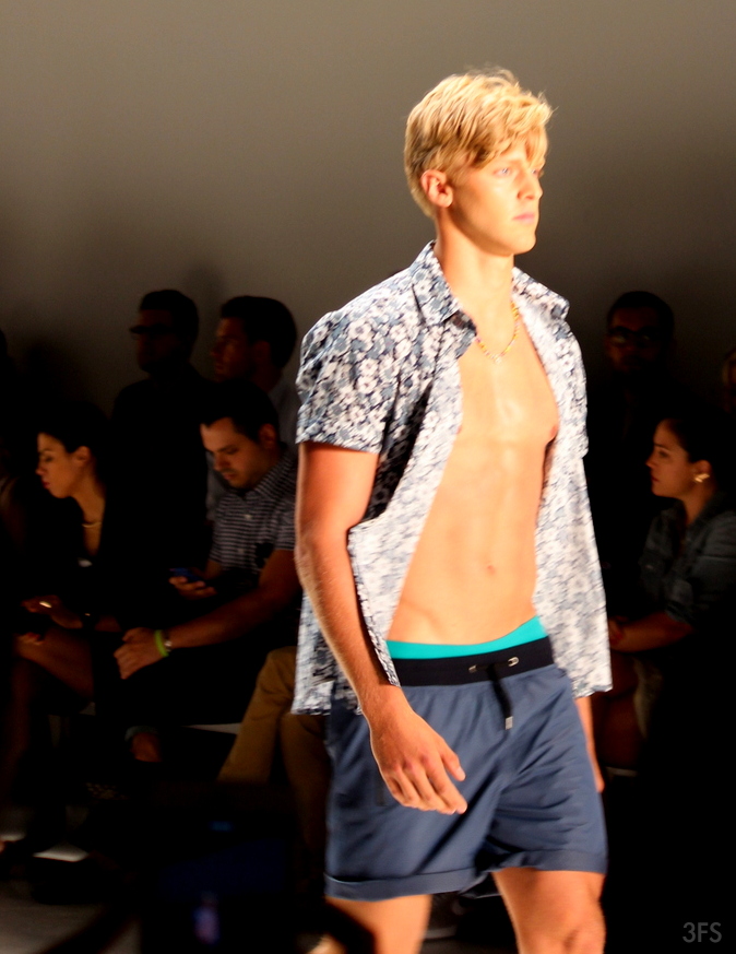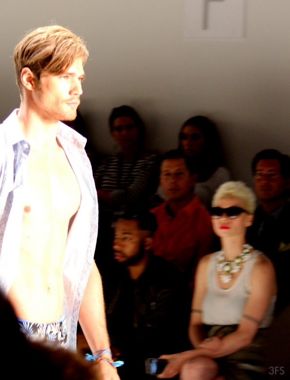 On related but disparate notes, George Sotelo of Thorsun didn’t go quite as brief, but presented a swimwear collection of luscious bathing suits. Similar to Parke and Ronen’s models, the free display of washboard abdominals was a precursor to the swimwear on display.