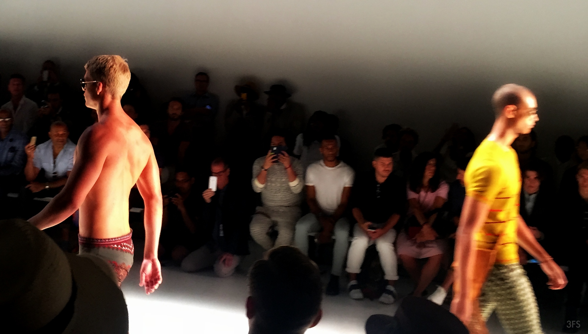 One of the most awaited presentations of fashion week is always Parke and Ronen, known for fitted swimwear and sexy briefs. In synch with the rest of fashion week’s trends, they presented some more relaxed fit outfits, without forsaking the need for a fit body as epitomized by their models. Starting with a retro music laser show and a theatrical opening, you knew that the show promised a lot.