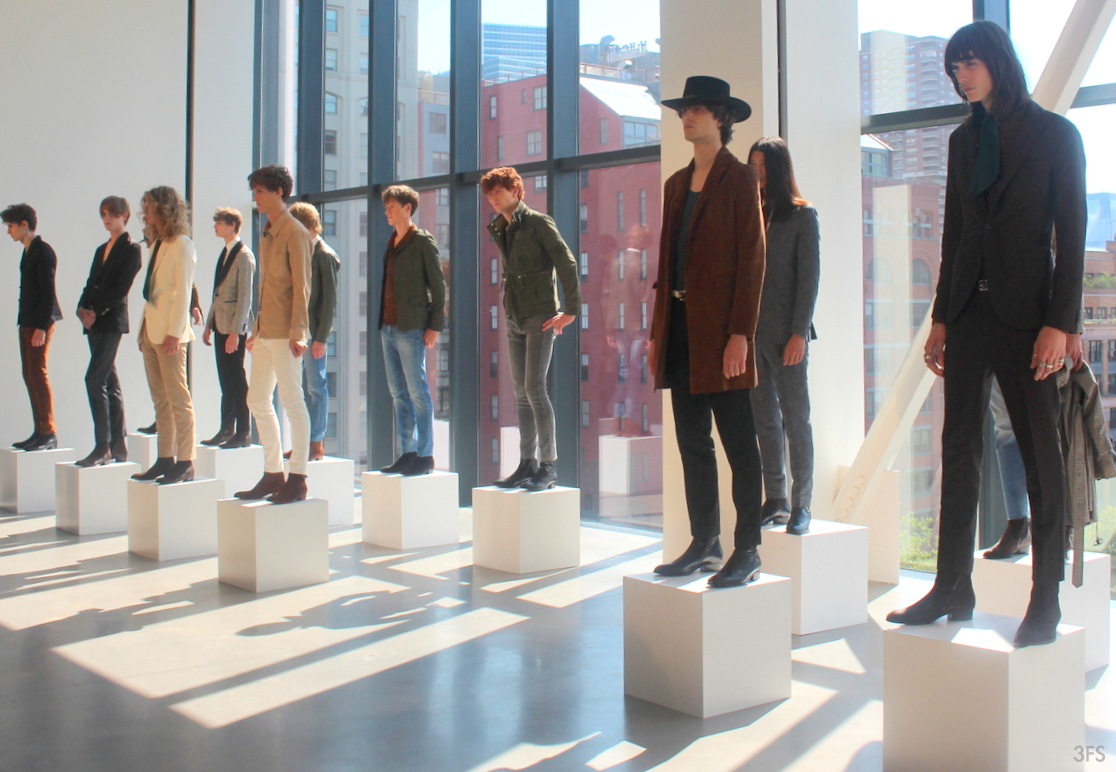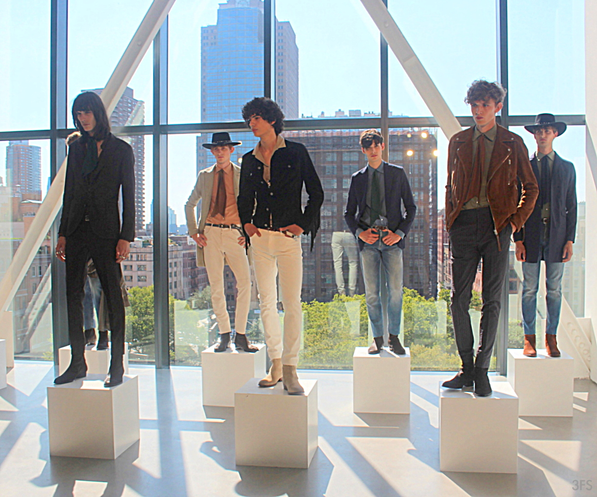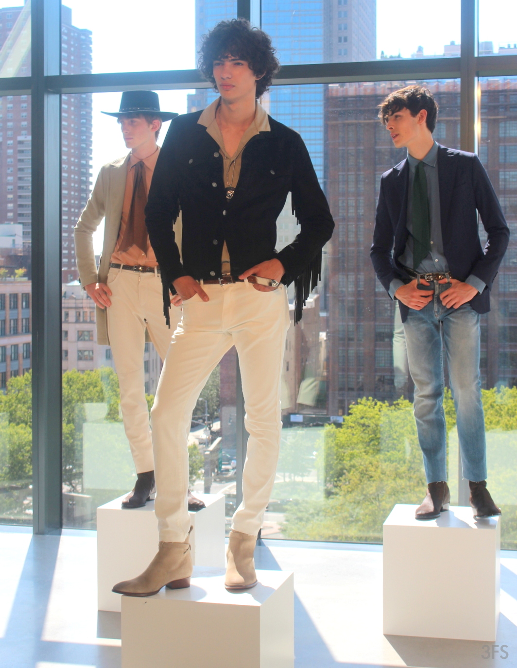 The Scandinavian fashion house has been around for nearly two decades and epitomizes a Scandinavian outdoorsy lifestyle, with independent brands for tailoring, golf and skiwear. In line with the sport themes at NYFWM, this took a less literal approach and relayed a more country time hobby, reminiscent of what one might see in 70s action flicks or in a setting fit for the Sound of Music remake. J Lindeberg marked the return of the retro cowboy look, complete with chocolate and earthy hues, suedes and pony hair textures, unskinny light wash whiskered jeans, epic short cut jackets with frays and tassels, and silver studded wide cowboy hats.