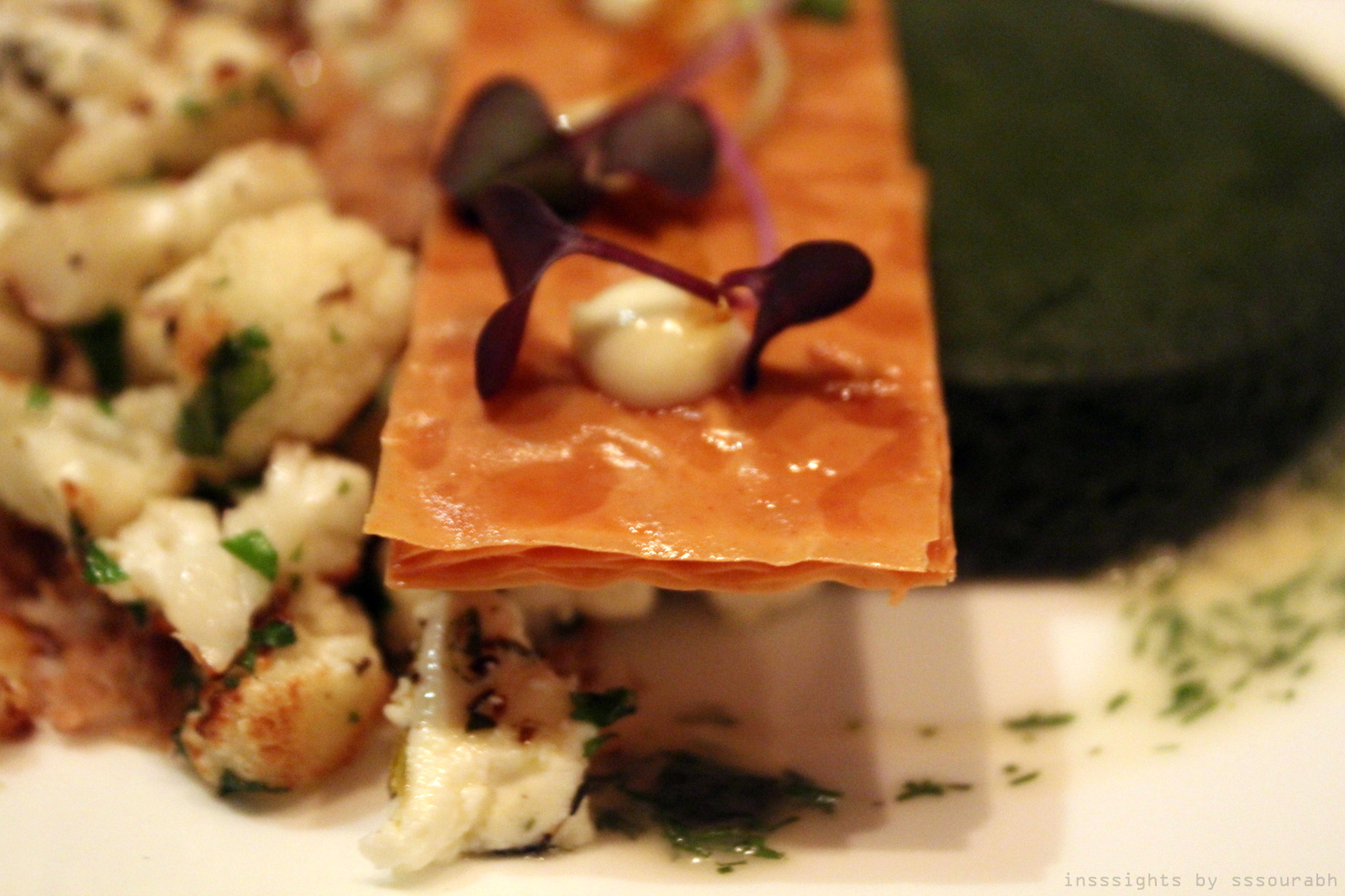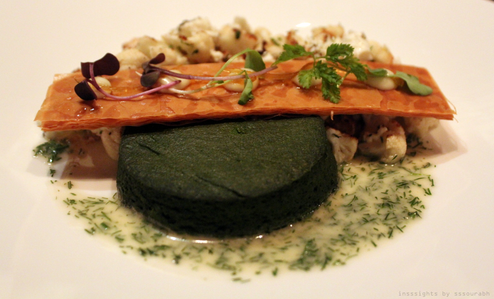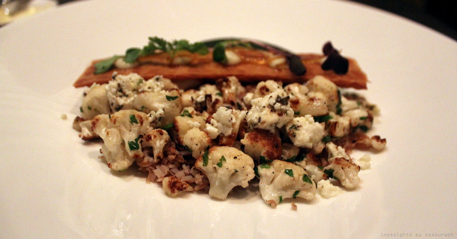 Mine was a half moon homage to a Gemini like quality of my indecision, shaped into culinary hemispheres. For what arrived looked no less than a work of art. It was in fact, the ever popular cauliflower cooked in goat cheese with rosemary and herbs on one side, with a savory leafy green cake on the other, simmering in goat cheese and herb chutney. It was hard to choose which side I preferred: the former was an earthy texture with a slight citrus tang, the latter was an herbaceous version of a dessert staple with depth of flavor.