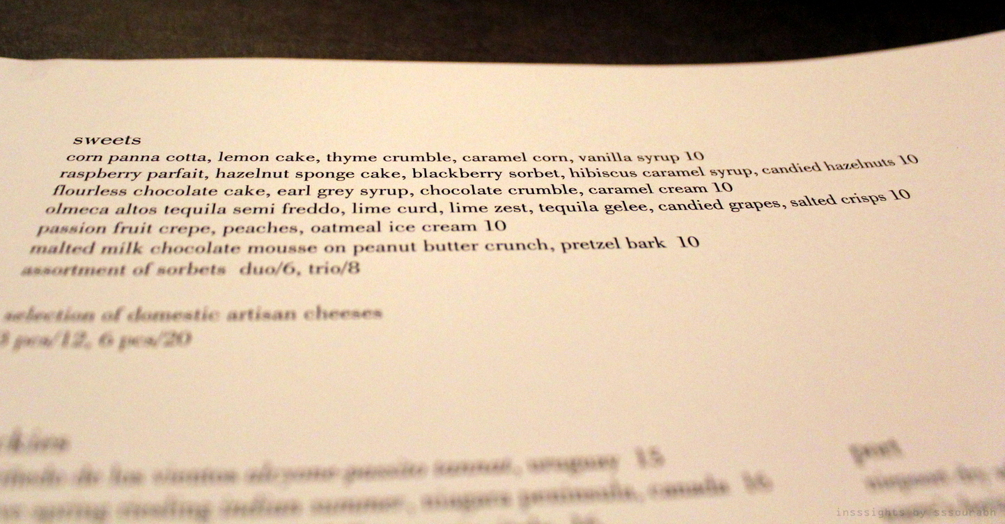 The pinnacle on this beautiful meal was the duo of disparate desserts. Both were creative and whimsical and drenched in flavor. The first was a raspberry parfait, which was not my first choice owing to my hesitance towards anything that is plunged in berry. However, the sidekicks of a hazelnut sponge cake (albeit torn into morsels), dark blackberry sorbet and candied hazelnuts for a crunch balanced the sweet berry flavor with tartness and texture, respectively. The most surprising was hibiscus syrup, a truly versatile ingredient, which lent the right amount of sourness to the dish.