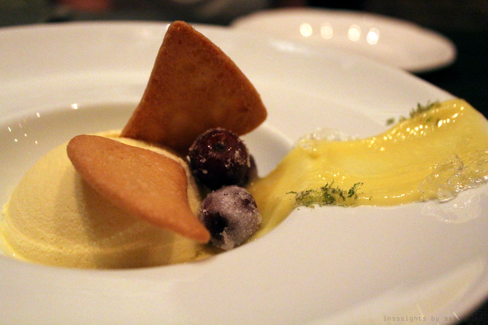 The second dessert, thankfully also sequentially second, was plated rather inventively and arrived with a rather surprising aromatic whisk of liquor. Tequila, to be precise! For it as an olmeca altos tequila semi freddo with lime curd and lime zest, accompanied by a generous brush of tequila gelee. While not a fan of gelatinous and wobbly desserts, the flavor juxtaposition in this one won me over. Especially the addition of a trio of frozen candied grapes, which with the tequila, transported me to a sepia world of elegant soirees. The salty crisps were probably not needed as the tequila overpowered the boozy dessert, and for once I could have done without a crispy textural note. The overall almost familiar winged delight of another Chicago staple was earthy and golden, in sunset hues that were almost painful to deconstruct, but equally delicious to gobble.
