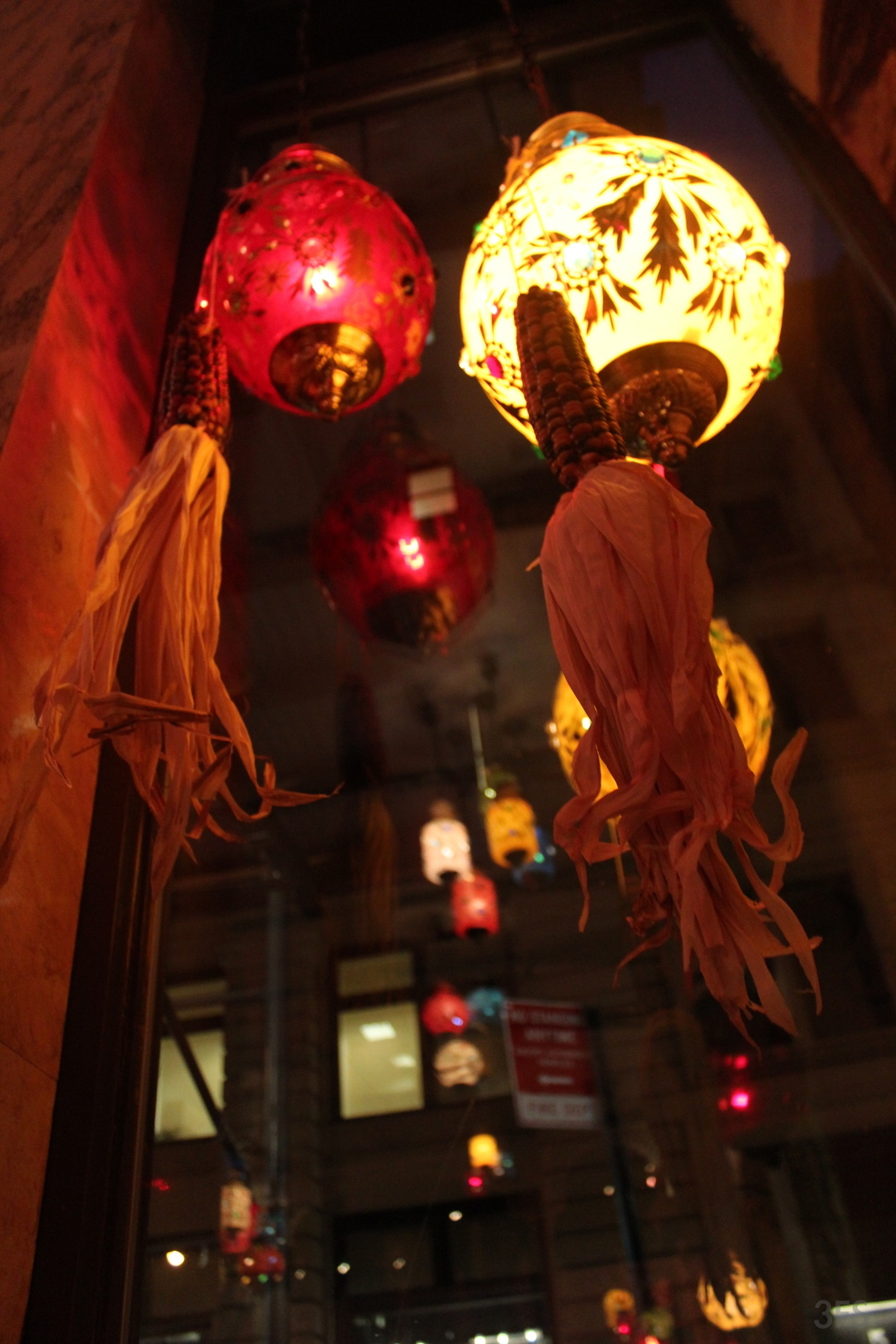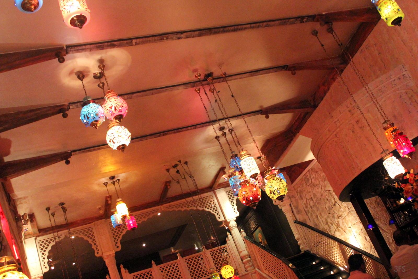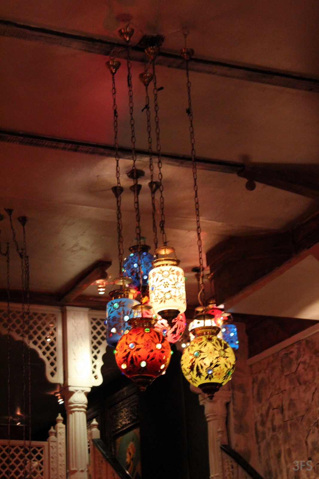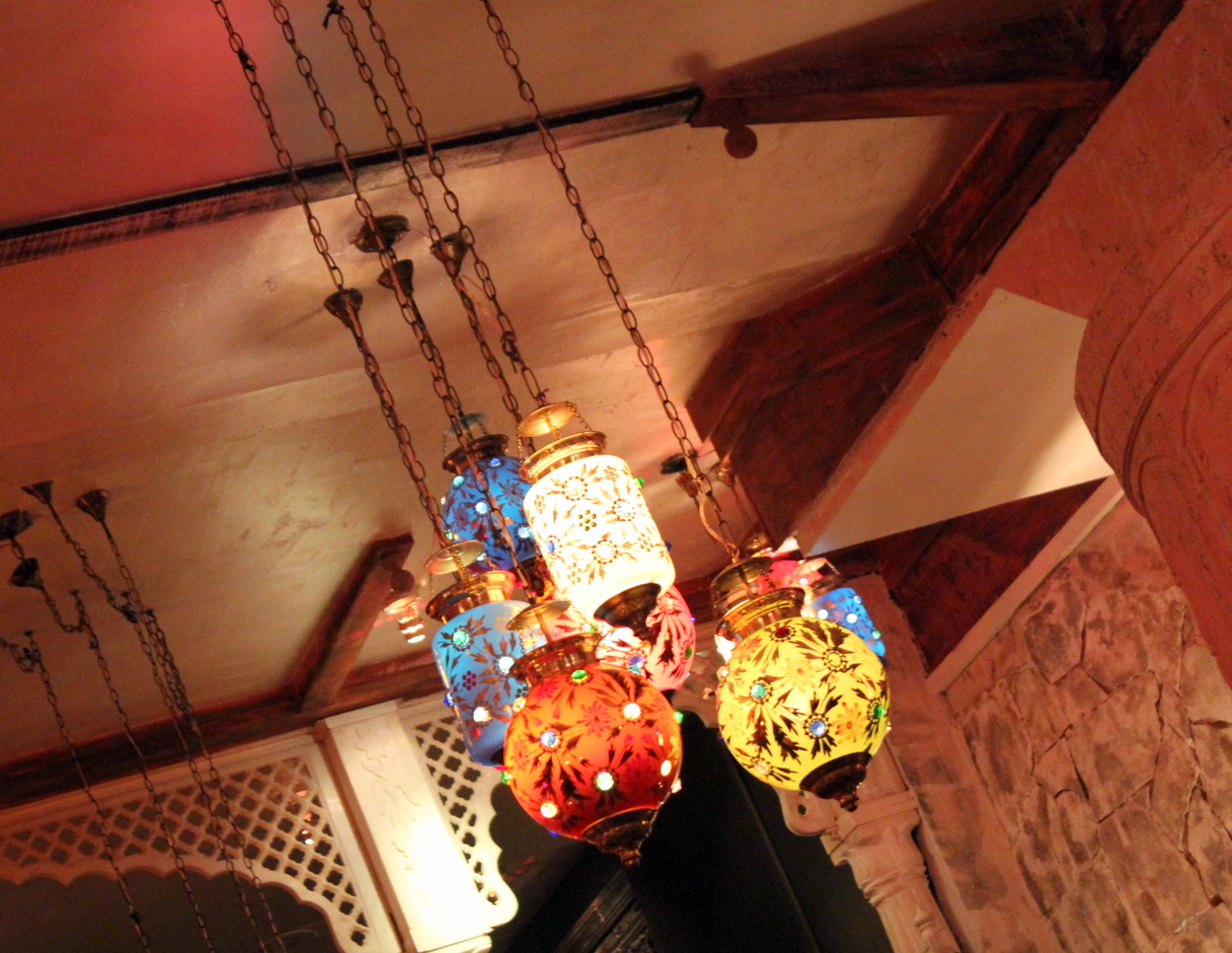 A petite, illuminated red two story seating style greeted me. The first thing I did was arch my neck to see the Persia-meets-Rajhasthan stain glass light fixtures hanging in multiples from a mystic ceiling space. With seasonal corn cobs in autumn hues and dim gold and bronze lighting, it was immediately comforting, banishing any fatigue, adrenaline and letting me sink into its comforting abyss. Red is my favorite hue, after all.