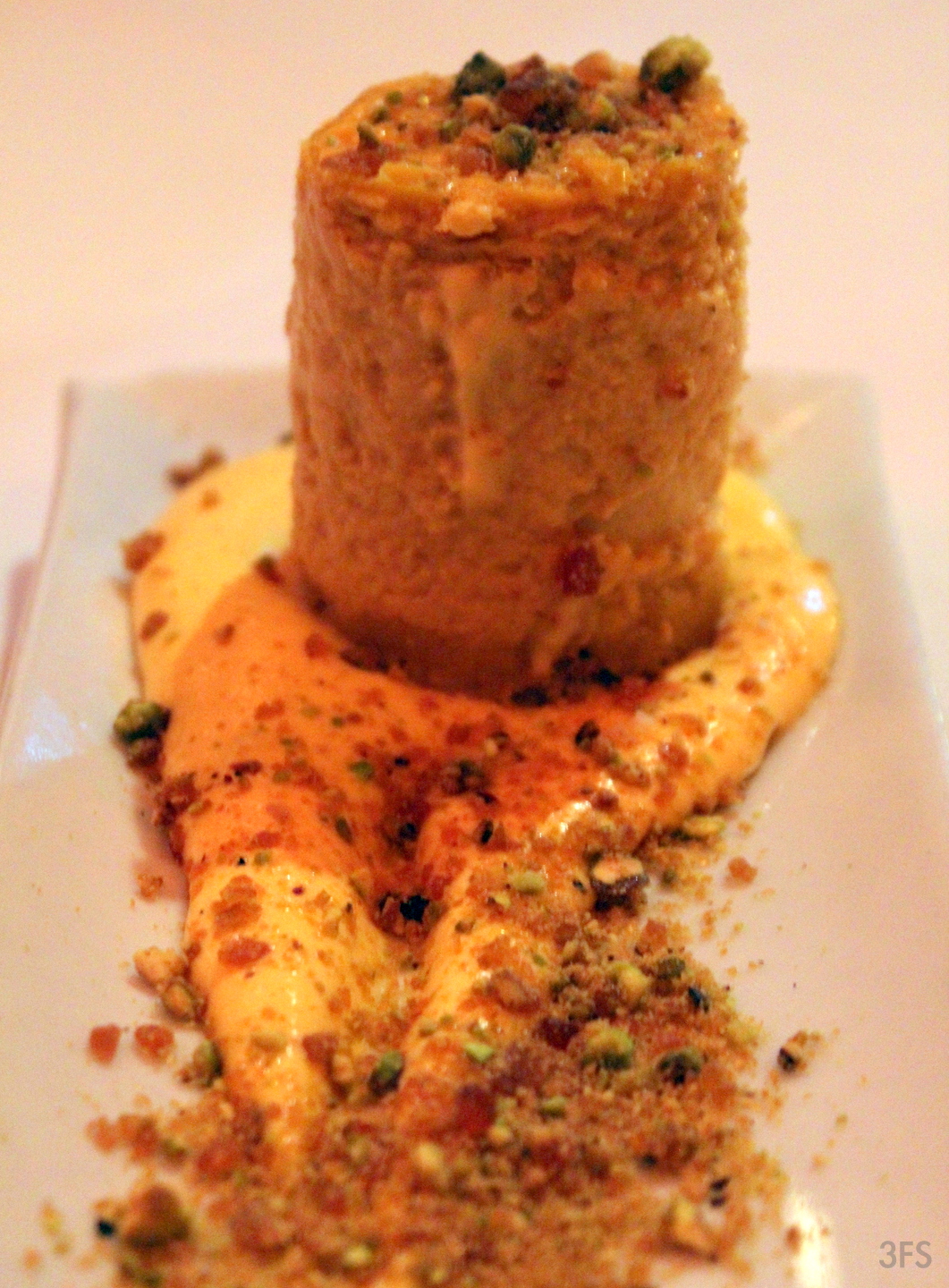 The mango almond cheesecake arrived shaped like a giant, gelatinous wobbling marshmallow atop a thick mango sauce, bordered with caramelized pistachio. With two nuts in this concoction, the textures were perfect: granular, crunchy and, despite being a soft dessert, alarmingly rigid and consequently filling. The mango was a subtle and sweeter flavor, which matched well with the nuts. Definitely a more superior cousin to a plain cheesecake, this one was more tart and made up for its softness with a nut duo.