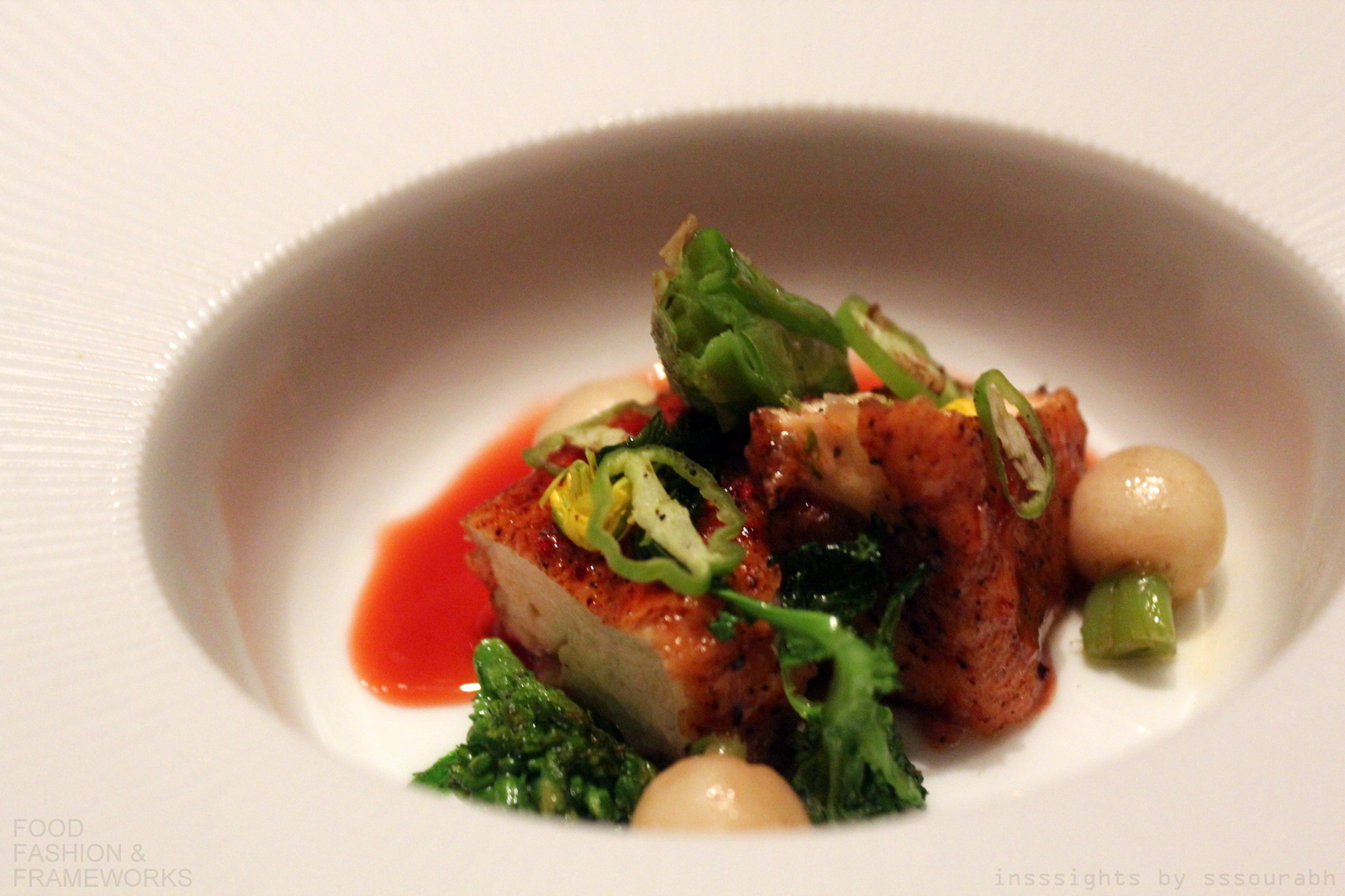 Being a keeper of whimsical combinations, I never thought I’d utter eggplant and wasabi in one word. Mainly because the two are not favorites (barring an eggplant steak situation), nor complementary. However, a rather Red Medicine looking plate arrived with both grilled eggplant and smoked eggplant purée, mushrooms, green purée, onion and herb puree and wasabi shavings. Wildly inventive, it delivered on its quirky promise: bitterness cut the gelatinous eggplant, made even more bitter with a sensuously smokey taste, with bursts of surprise from the pang of wasabi, which in turn was the surprise element and showstopper in this dish.