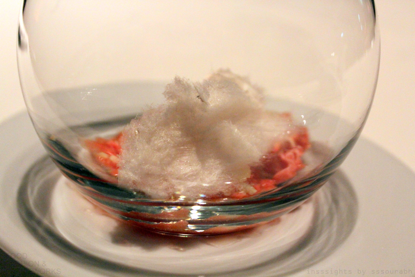 After a perfect ten, the dessert journey commenced, my favorite in the sequence of starry dishes: dessert. Being an admitted multiple dessert-aholic, I was gushing in the splendor at the though of four desserts. The inventive palette cleanser was called condensation, hopefully not referring to the caloric proportions worth their weight in gold that I had inhaled. Almost evaporating in my seat, I saw a retro looking sphere filled with kaleidoscopic views akin to a snow globe. It was filled with black pepper cotton candy (add that to your adventure list, San Francisco), Thai basil, Kalamansi lime olive with small strawberries. The latter constituents were in minuscule proportions, adding a zesty, cleansing taste that paired regally with the saccharine cotton candy. To say that I could have eaten a kingdom’s share of this would not be an exaggeration.