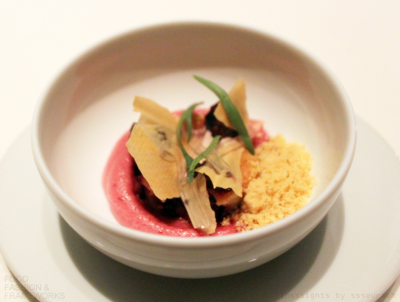 The dessert theme was oceanic, which made me yearn for beachy escapes in Miami, or very simply, a plunge down the Magnificent Mile to Lake Michigan’s iconic shorefront. The visibly deconstructed dish was a calming hue of muted yellow and baby pink. The center was a ginger cake made of Galangal (the rhizome of ginger), more fibrous and slightly spicier! Balanced with sweet Banyul dessert wine sauce, sweet and aromatic rose foam, the balance was ethereal. The accompaniment of savory galangal chips and fresh tart blackberries added the crunch and freshness that made a merman out of my taste buds.