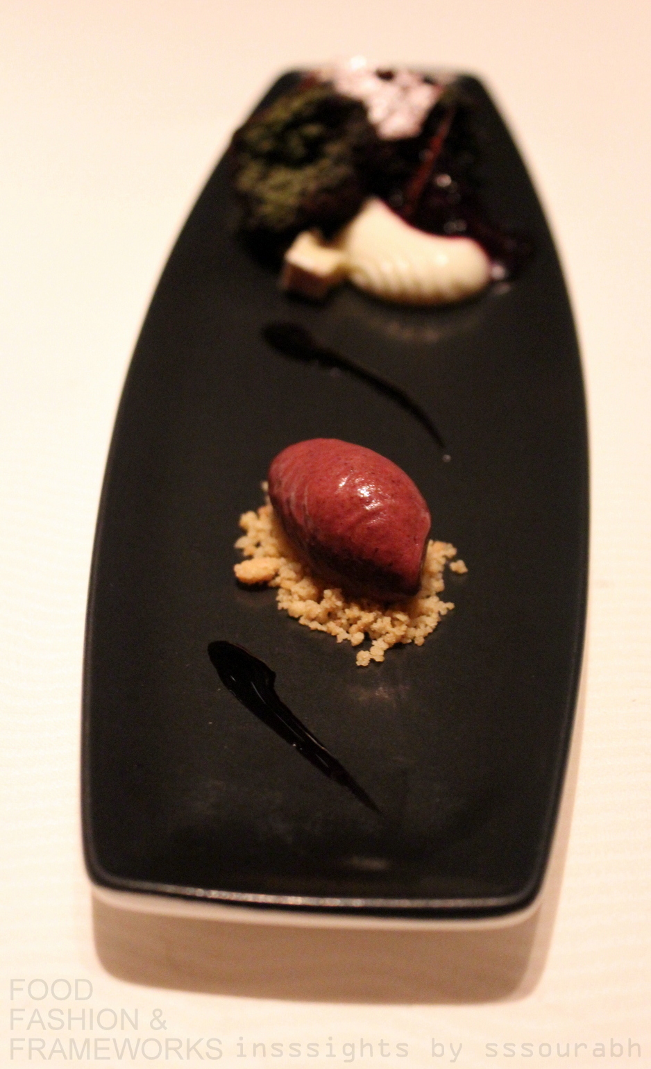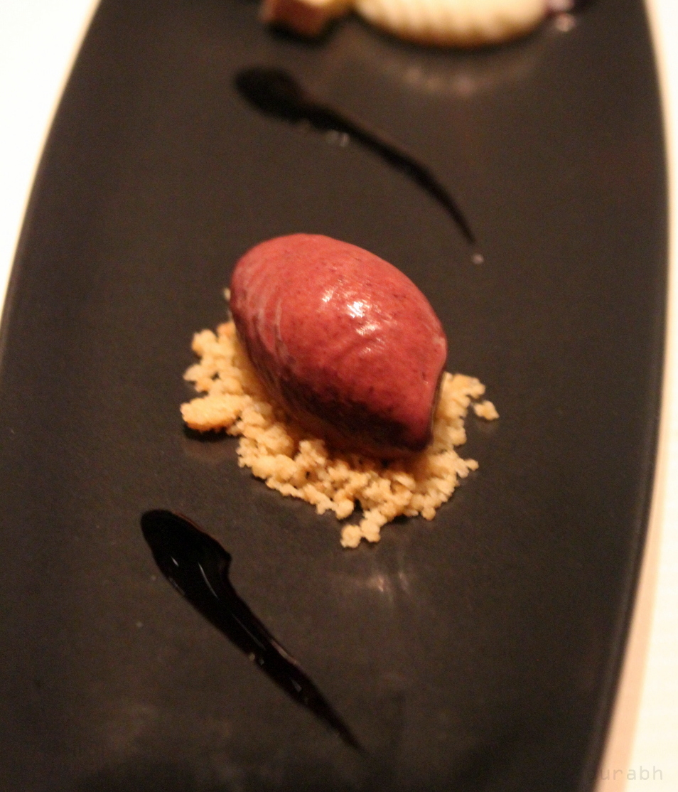 After lighter desserts that bobbed on my dream and tongue like boats, the stars shifted towards a darker, richer story. Presented regally on another black plate was a dense, rich and boozy Cognac chocolate cake, a blueberry glaze cheese cream and raw gruyere cheese. The cheese and chocolate combination was akin to a boxing punch to my taste buds, a remarkable, inexplicable and oxymoronic juxtaposition of a marriage which worked! Having tried it in Beverly Hills before, I couldn’t help but think that my favorite cities always struck the right culinary chords. The bitter chocolate flirted sensuously with the smooth and velvety cheese, almost interchanging their sweet and savory properties, with chocolate playing cupid and my mouth acting as a venue for this sonnet. A fresh blueberry sorbet brought my starry daydreams back to earth (well, sixteenth floor), placed on a bed of a simple, aromatic vanilla crumble.
