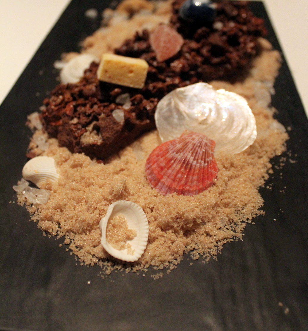 The sommelier walked over with the last plate, advising me that it was an optical illusion, and that he would stand by to see that I didn’t eat anything inedible. For what came forward was a succulent replica of a beach landscape. With real sand, luminescent seashells and a wooden plank for cliffs, I blinked repeatedly to ensure that I wasn’t seeing a graham crumble, fondant art and chocolate bark, respectively. The game was to decipher what was edible, and I soon enough noticed some irregular specimens perched on the beach like lovers in longing. First was a peach candy, shaped like a cuboid with a strong fruit flavor that bid adieu to the cognac aftermath in my mouth. A tangerine shaped spicy mango marshmallow plunged me right into childhood with its whismy in replicating a kiddy sour candy. An omenic half moon shaped salted caramel truffle looked like a work of art, and tasted like the purest of chocolates, almost kissing me goodbye from a night saturated with showstoppers aplenty.