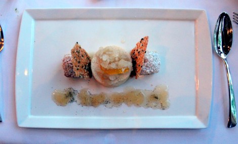 Next up was a banana caramel ‘croustillant’ with pineapple granita and cardamom ice cream. The ‘spring roll’ like appearance masked the sweet, Hawaiian flavors of banana and caramel, but the bitterness of the crispy crust cut the sweetness brilliantly. The tangy granita and spicy ice cream further elevated the juxtaposition of temperatures and flavors, providing a refreshing perspective to the indulgent dessert.