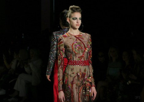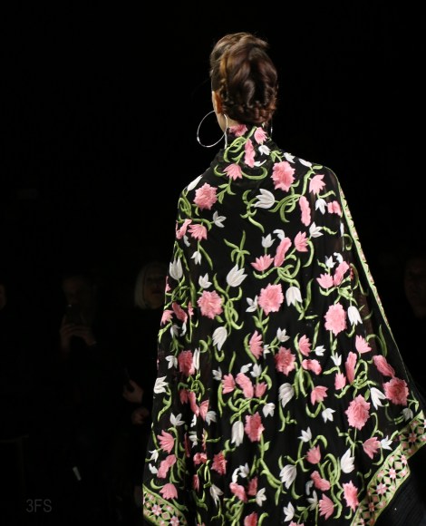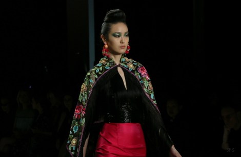 The message of diversity was prevalent through not just the choice of models, but also the geographical inspirations. There were Italian fabrics, Spanish hats and ruffles, Peruvian handiwork, capes like kimonos, shawls with Mexican style floral prints, salwars from India and Pakistan, and much more that created a melting pot of colorful, textural and flamboyant designs. The gowns came in radiant colors of the entire rainbow spectrum, with juxtaposed designs of pearl embroidery, gold leaf prints, mirror embroidery, and visibly chunky embroidery.