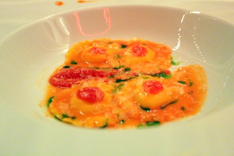 Wading right into a hearty Italian dish, next was a buffalo mozzarella ravioli with tomato sauce and Parmesan cheese. The duality of cheeses flirted with my love for the dairy, and the dollops of cherry tomato atop each ravioli made the plate a slightly suggestive but colorful dish. Taste-wise, I liked the salty Parmesan in contrast with the creamy mozzarella, balanced with the richness of tomato and once again, asparagus juice!