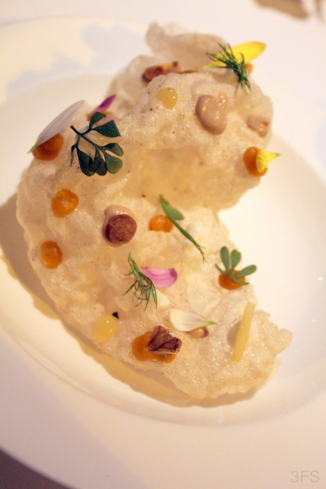 Up next was the rather intriguing green olive and chlorophyll soup with white chocolate ice cream. With full on gastronomy at play on traditionally street side ingredients, the combination was mind boggling – who would have thought a bitter and briny olive soup of sorts would pair so well with a sweet and velvety dollop of ice cream? Genius.