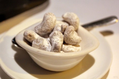 As a side to the coffee were a bowl full of what looked like sugar dusted cashews. But on closer inspection, it was white chocolate dust, thus giving it a deconstructed nougat flavor which was thankfully not saccharine, and a perfect companion to strong espresso.