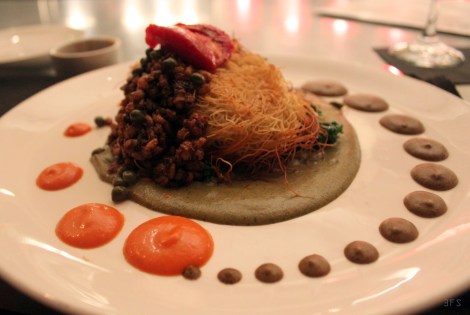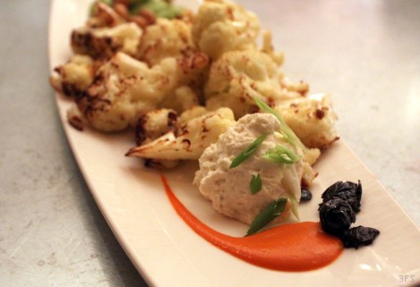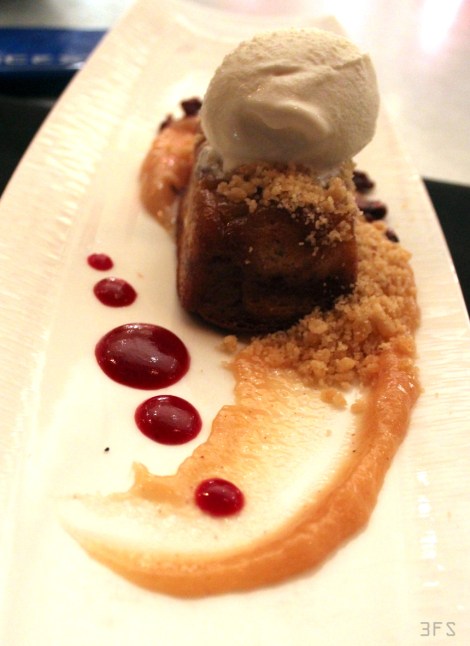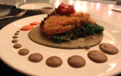 The entree comprised of a Middle Eastern sounding katafi savory pastry which came as a crown on a plate, surrounded by polka dotted sauces in two hues, looking much like a fantasy of The Little Mermaid. It was a spaghetti squash and sage, fontina cheese, golden raisins, poblano gravy, charred eggplant puree and black olive barley tapenade. With an array of ingredients and textures, it was a party in my mouth. The crunchy katafi was offset by the greens, with the salty olive sauce contrasting with the smoky eggplant one, making for a sumptuous slurp when scooped at once. The spice factor came with the few dots of poblano, while the barley added a nutty bite that was distinct from the spaghetti crackle, making this a meal for all senses… particularly auditory!