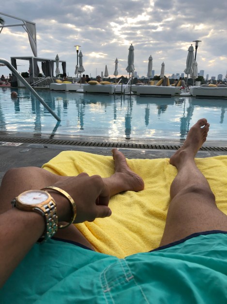 With floor to ceiling windows yawning into the bay with a Miami skyline in the distance as I poured a sunset, the flirtatious Latino bartenders poured me many a cocktails and frozen rose wine too many for inebriation during the art festivals, particularly by the pool and al fresco at Mondrian Caffe.