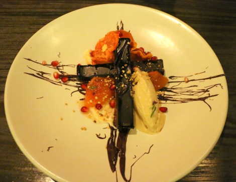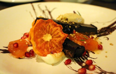 Of desserts, I opted for the conservative sounding chocolate ganache tart, only because I knew that by this point, it would be anything but ordinary. Arriving as a Christian cross of thick, dense and shiny chocolate that I almost licked from the server’s fingers, it was on a bed of honey brûlée, cashew ice cream, fully cut persimmons and bee pollen. The chocolate itself surpassed every expectation of indulgence, and the bee pollen added a crunch that honey would have glossed over. The citrusy fruits were sprinkled with pomegranate arils, my favorite of all fruits, which were an offset to the hearty cashew ice cream, again a smart textural choice for a heavy nut. In one scoop, it was a dizzying balance of fully dessert savvy flavors.