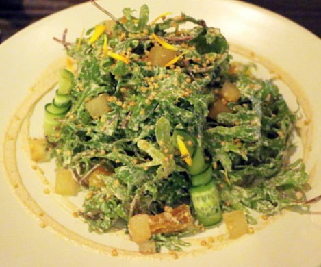 Being in California, I next opted for the gastronomical take on the baby kale salad. This one was fruitified with pickled asian pears, dried apricot, cucumber, almond dressing and a dollop of crispy quinoa. The twist on turning the crunchy nut into a dressing and the spongy grain into a crackle was very inventive, and the harmony of sweeter fruits rendered this usually bitter, healthy salad into a sweet delight.