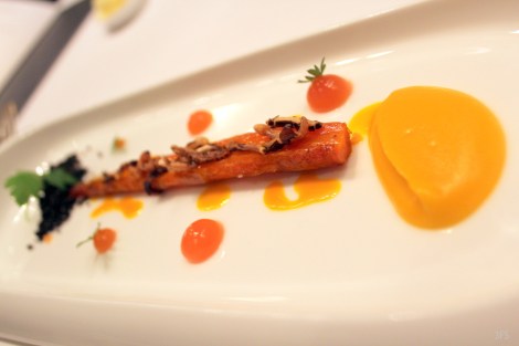 The roasted bell pepper was served artfully on bell pepper spicy jelly with tomato concentrate, a clear liquid and petite fried onions. The essence of pepper could be found in the spicy scent, and the uncharacteristic spice of the otherwise innocent looking pale liquid. The result was a spicy bite, eased by the temperate chillness of the plate. A red lover’s delight.