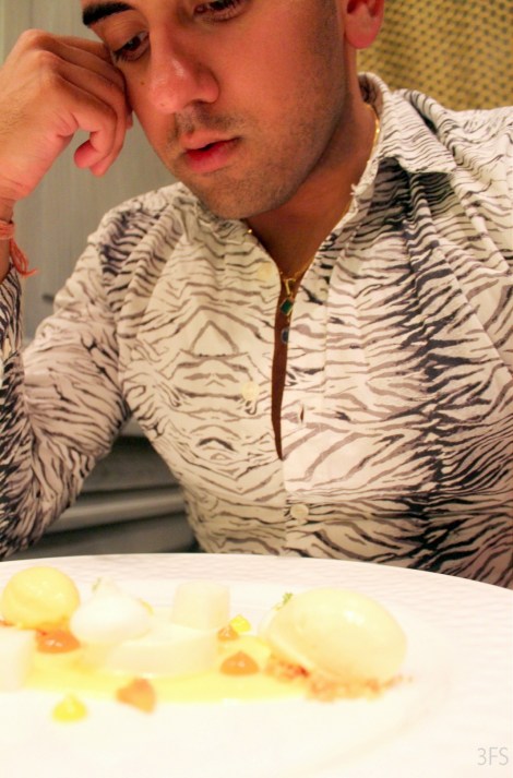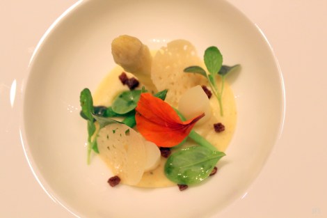 Many Italians can quote that gnocchi is my favorite Italian dish, far above everyone’s staple pizza or risotto. This was a gastronomical variation, with egg yolk noodles in their vibrant gold hue! The wild garlic oil was laced with asparagus oil, giving this star vegetable yet another feather in its culinary cap. While delicate to eat texturally, what with my sloppy dynamic, it was a tasty, rich and satisfying gobble.
