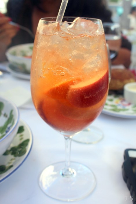 While we were served Moet Chandon while posing for shutterbugs, I got a glass of the freshly made apple and peach sangria to match my sunset tee and Illesteva eyewear, perfect for gaping at onlookers, often lurking behind gigantic rose bushes or swinging by to flirt while picking up roses from our bubbling vase of blooms.