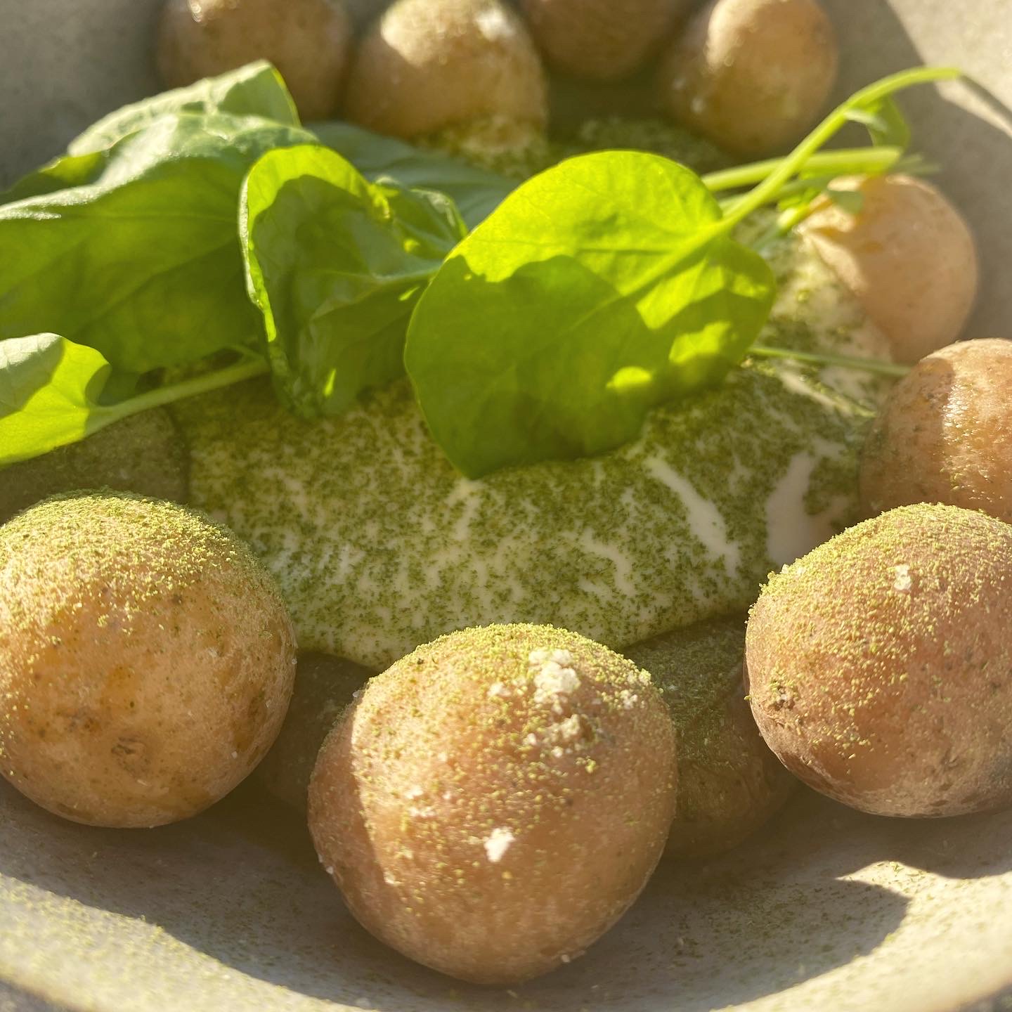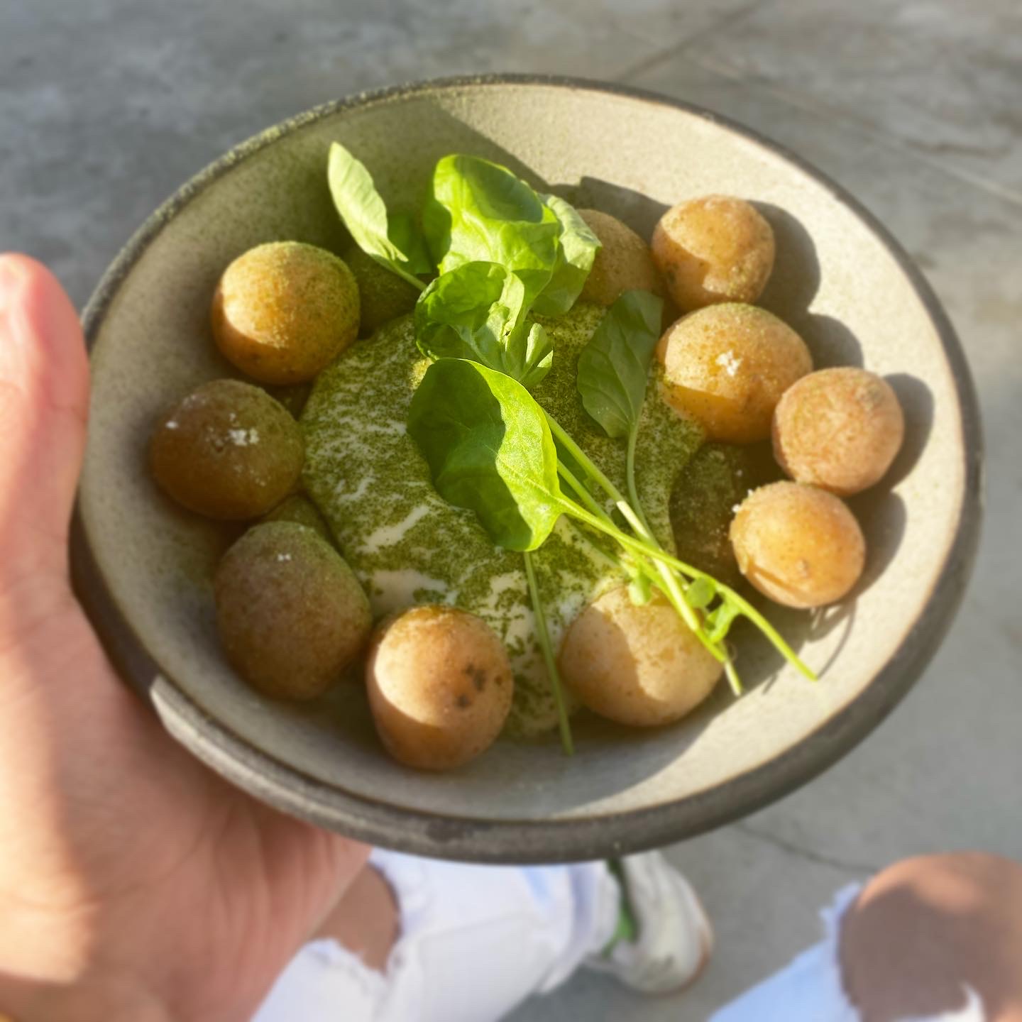 With a love for potatoes and potato characters, I opted for a main course with poached egg, baby potatoes, smoked dates and greens. The potatoes were truly the star, multicolored with their skin and melting into the sweet smokiness of the dates, like a Scandinavian spring bite. The poached egg added the nutritional and the moisture, almost unlike an egg but more of a sauce, making it a game-y munch offset with green finery.
