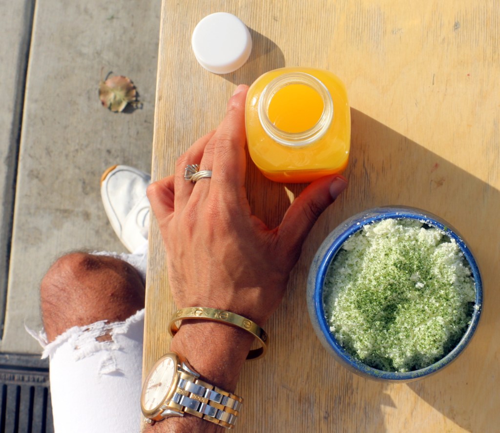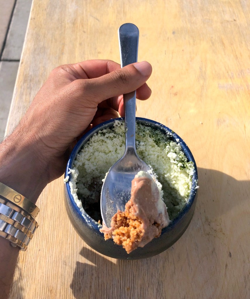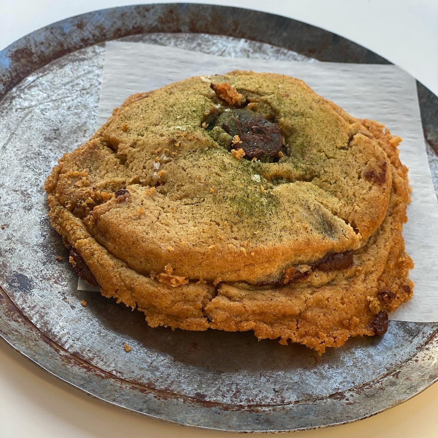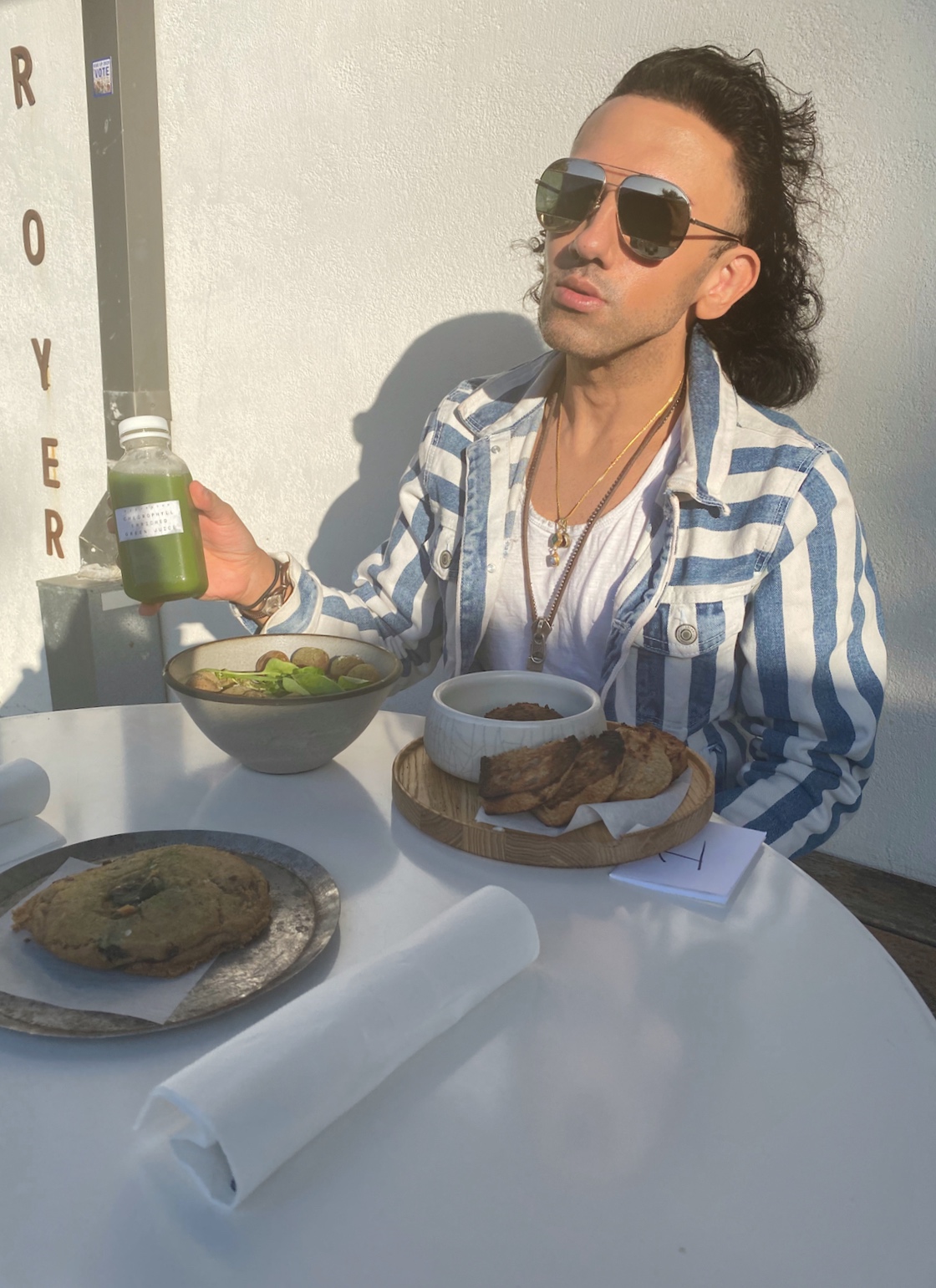 Forget milk and cookies or cocktails and nuts, I opted straight for a vegan matcha cookie in gigantic proportions, alongside chlorophyll enriched green juice and turmeric orange juice. Because, when in LA, blend into the mordant wit of the crowd. With a lack of saccharine sweetness to the cookie, the bitter matcha blended well with the plant and spice forward juices.