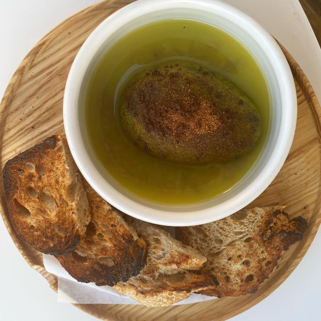 The vegan avocado version of the confit was a bitter ode to gastronomy, with burnt onion (a scented disaster saved by a sweetly alluring aroma, surprisingly), roasted kale oil, and avocado cured in olive oil. A very strong, purified flavor emerged that could be slurped up with bread, which I would’ve preferred with crackers in some sandy, wheaty texture.